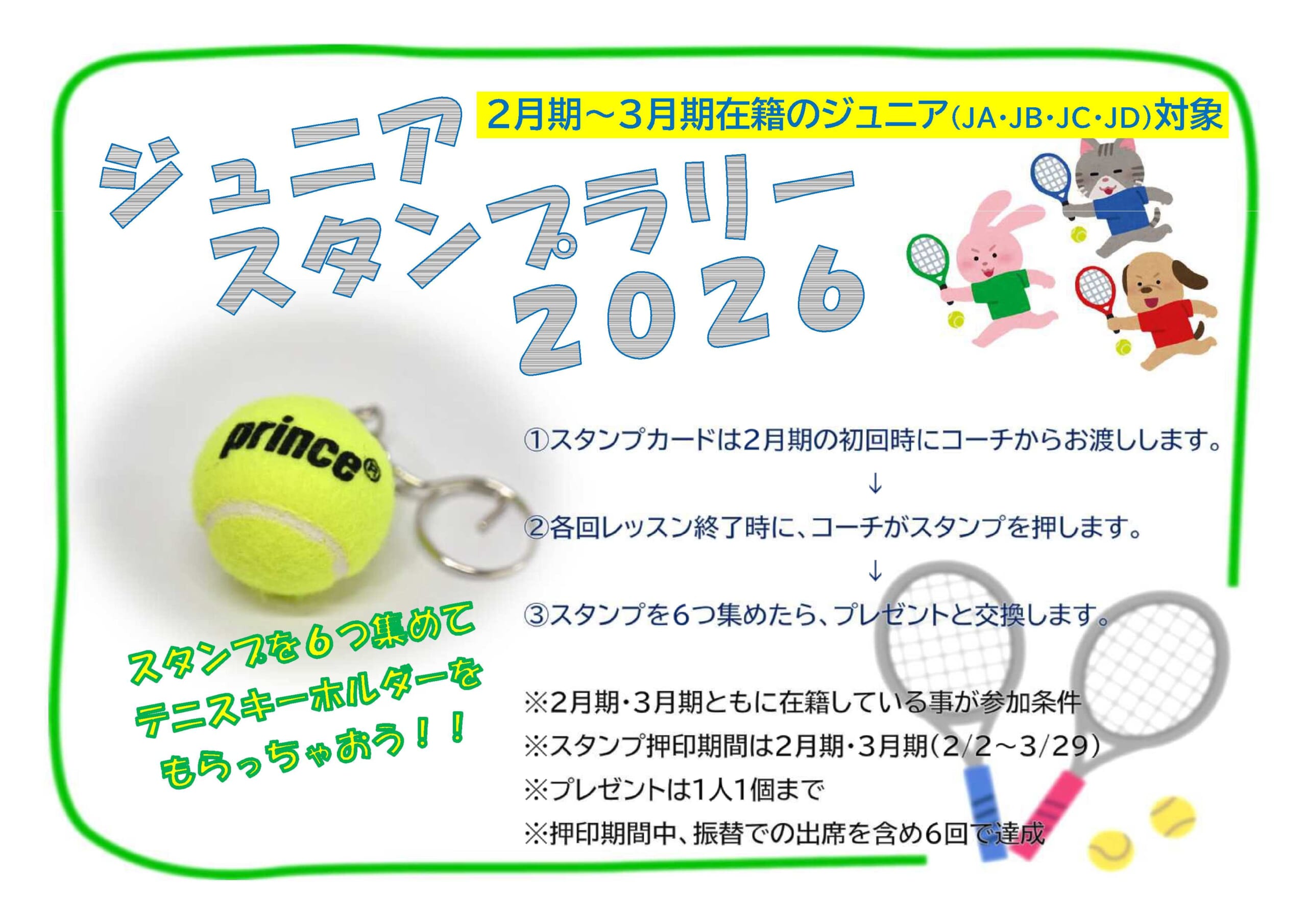 ジュニアクラス(JA・JB・JC・JD)在籍のスクール生を対象に、スタンプラリーを実施します! 2月期・3月期(2/2~3/29)にて、6つのスタンプを集めると素敵なテニスキーホルダーをプレゼント!! 振替受講でもスタンプを押しますので、元気にスクールへ通ってくださいね!